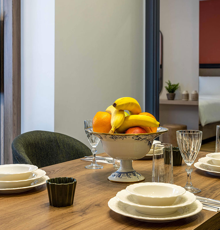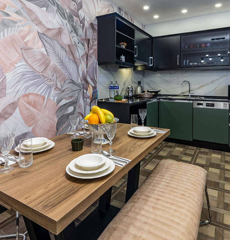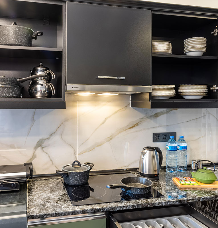 In this apartment type, which we designed to host our large families of up to 6 people, there is a master bedroom with 1 King Bed and a second bedroom with a bunk bed for 2 people. With the use of sofa beds in the living room, 6 people can sleep comfortably.
